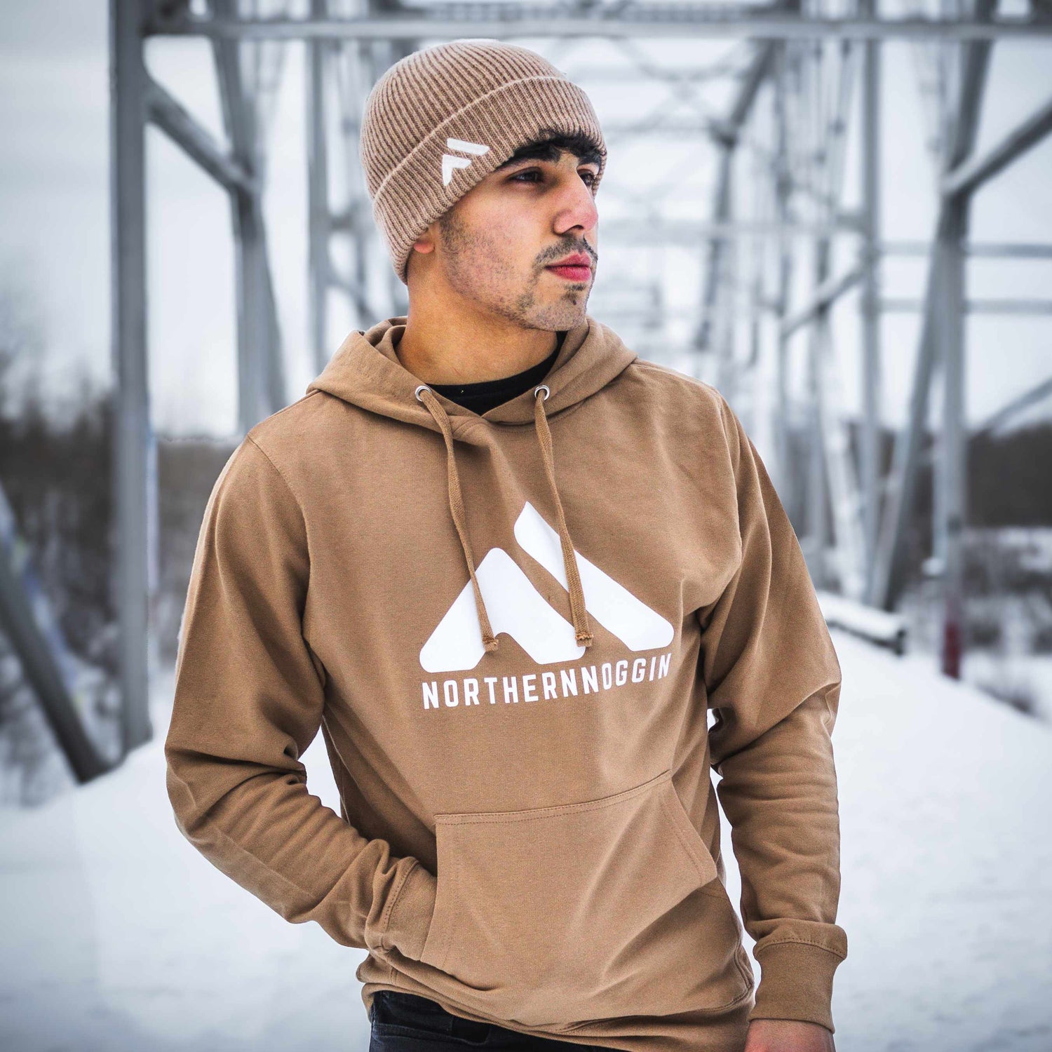 Designed for those who love the finer things, this tan mid-weight pullover hoodie boasts a tailored fit that complements any body type. The versatility of this hoodie's blend ensures durability and resilience. This hoodie's design has a comfortable hood and a front kangaroo pocket. The jersey lined hood is designed and made to bring comfort to your noggin, and the large front pouch pocket is perfect for keeping your hands warm or stashing your belongings on the go. Whether you are going outside or relaxing indoors you will never want to take this hoodie off because of how soft the inside material is. Grab your Northern Noggin hoodie today!